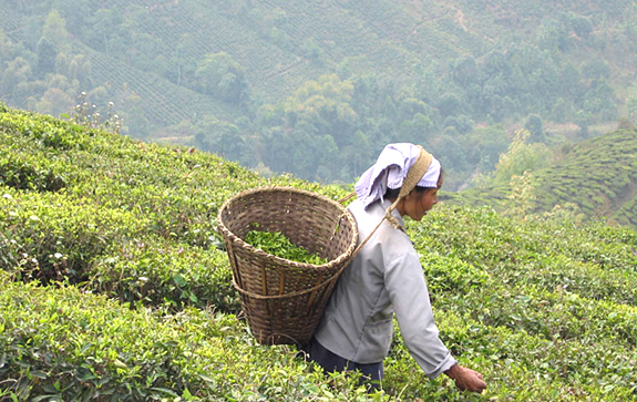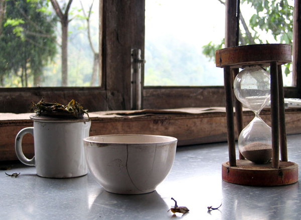 A tea worker picking and storing freshly picked tea leaves in a traditional bamboo basket on the steep slopes of Darjeeling, India. Right photo: A traditional cupping set and hour glass timer used to prepare and evaluate first flush darjeeling teas.